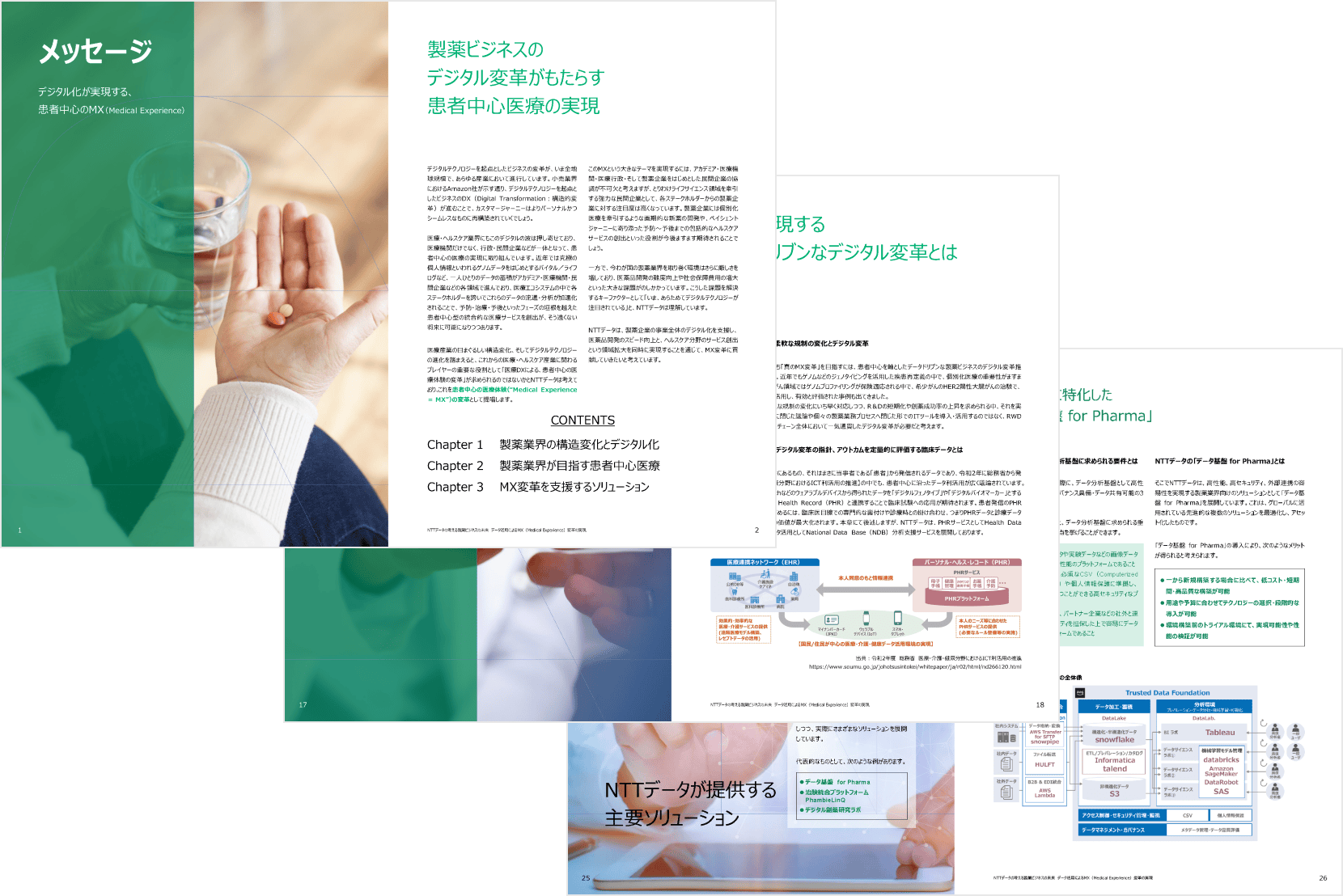 NTTデータは、製薬企業の事業全体のデータドリブン化を支援し、医薬品開発のスピード・精度向上と、ヘルスケア分野のサービス創出を同時に実現することで、MX革新に貢献します。