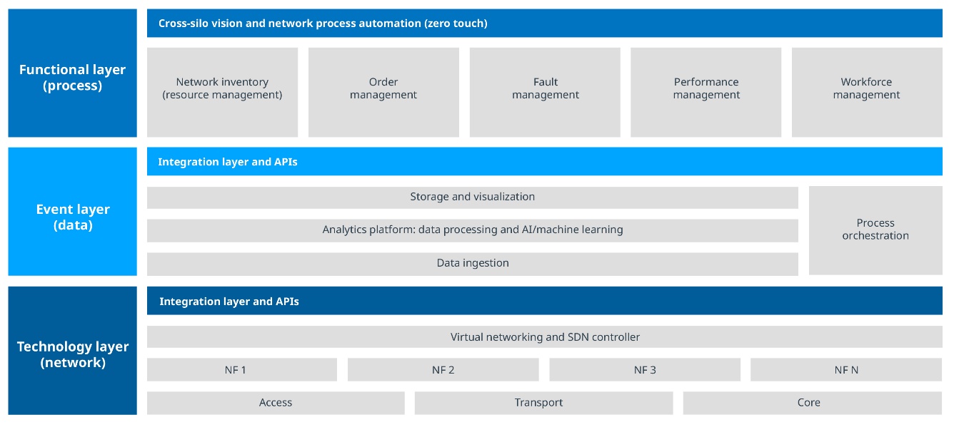 NTT DATA's Next Gen OSS solution was developed based on the principle of three layers designed to tackle the challenges mentioned above while helping operators capture the associated business opportunities: