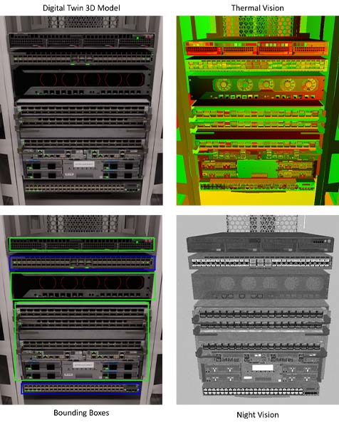 Using data center digital twins, AI can leverage the photorealistic environment to simulate and optimize various operational scenarios. For example, robots can be trained to autonomously perform tasks such as server maintenance, cable routing, or equipment installation. The photorealistic environment provides a realistic setting for AI algorithms to learn and adapt to different situations, improving their ability to handle real-world challenges within the actual data center. In this scenario, AI algorithms can analyze the digital twin's photorealistic representation to understand the spatial arrangement of equipment, identify optimal paths, and develop efficient strategies for completing tasks. By iteratively training and fine-tuning the AI models within the data center digital twin, robots can acquire the necessary skills to perform complex operations accurately, quickly, and safely.